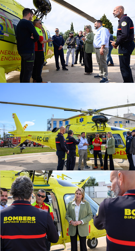 La presidenta de la Diputación de Castellón, Marta Barrachina, ha visitado el helicóptero de rescate que está operativo en la provincia durante estos días de mayor afluencia de gente en las montañas de la provincia. Este helicóptero de rescate tiene establecida su base en el parque de bomberos de Plana Baixa en Nules junto al equipo de bomberos de la Unidad Rescate Montaña, “un servicio con el que ganamos en tiempos en las emergencias que puedan surgir durante estos días de gran afluencia de gente”, ha informado Marta Barrachina.
