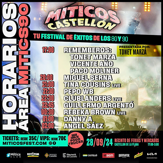 La cita estrena Mitics90 Área, un escenario remember que recibirá los directos de Tina Cousins, Rebeka Brown y Clublanders, y las sesiones de Miguel Serna, Tonet Marzà, Vicente Añó, Paco Moliner, Danny A, Ángel Sáez, Pepo WB y Guillerno Argentó
