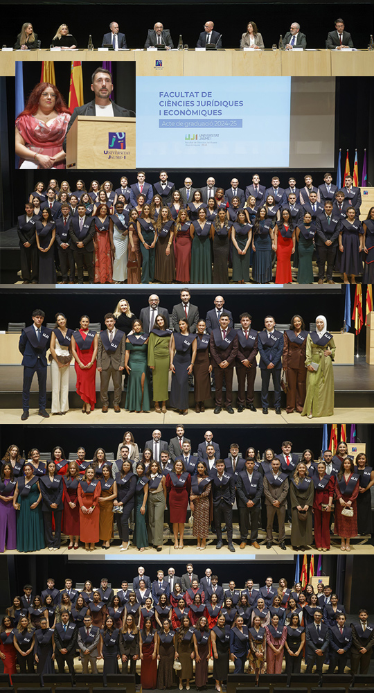Un total de 330 estudiantes de la Facultad de Ciencias Jurídicas y Económicas (FCJE) que han finalizado los estudios durante el curso 2024-2025 han participado en el Paranimf en los actos de graduación. Los actos han estado presididos por el decano de la FCJE, Joan Antoni Martín, y los vicedecanos y vicedecanas de este centro.